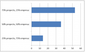 Realizando un corte más a profundidad y considerando el ámbito de acción de los participantes, les comparto que 29 de las 53 respuestas que consideraron al 75% de ponderación del proyecto como el elemento más importante, provinieron de individuos vinculados al sector financiero, es decir, los propios banqueros le dan más peso al proyecto que a la empresa. Por otra parte, un nada despreciable 37% del total de respuestas de los “desarrolladores” consideró que la ponderación de la empresa debiera incidir en cuando menos el 50% para la toma decisión.